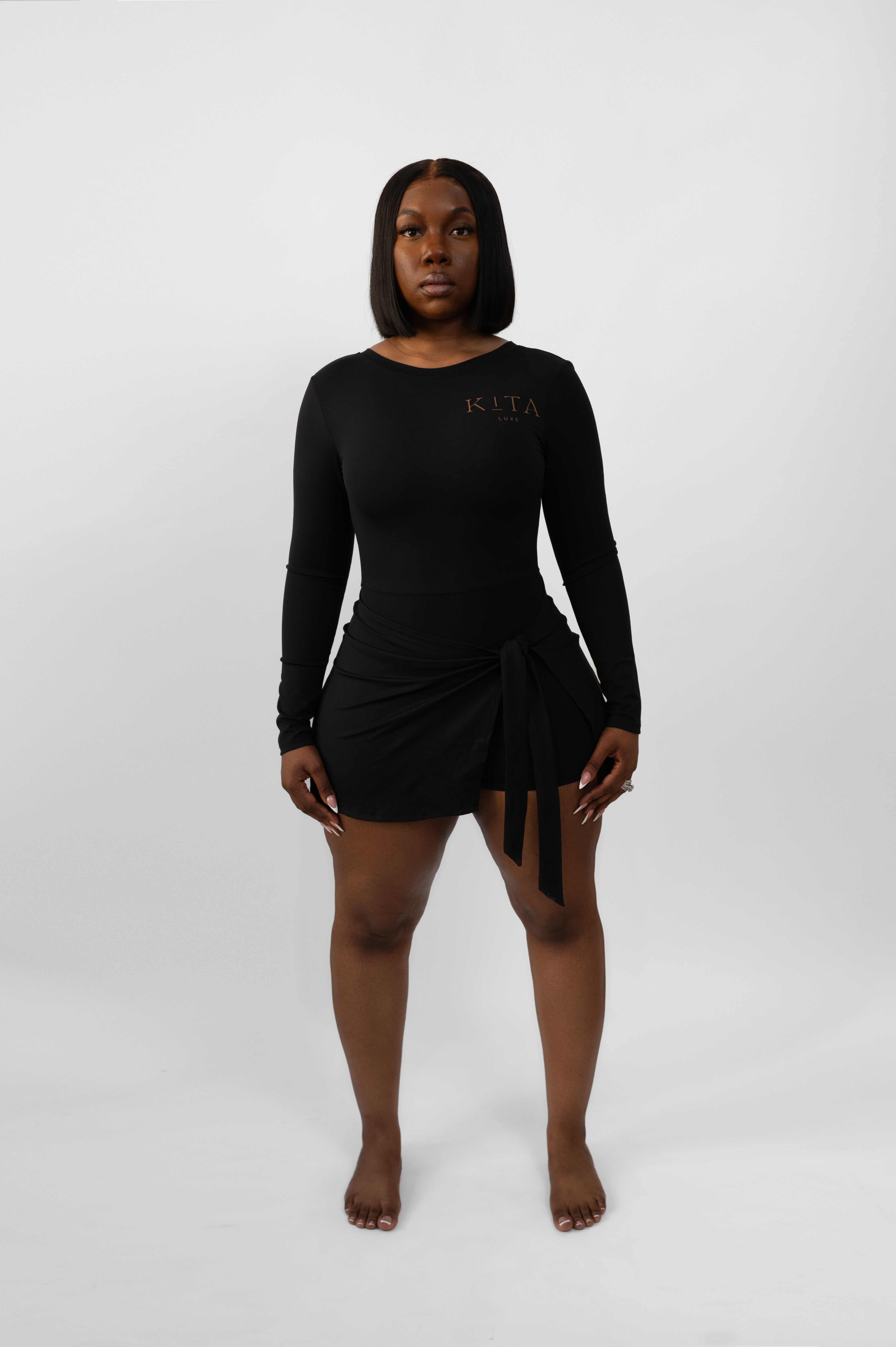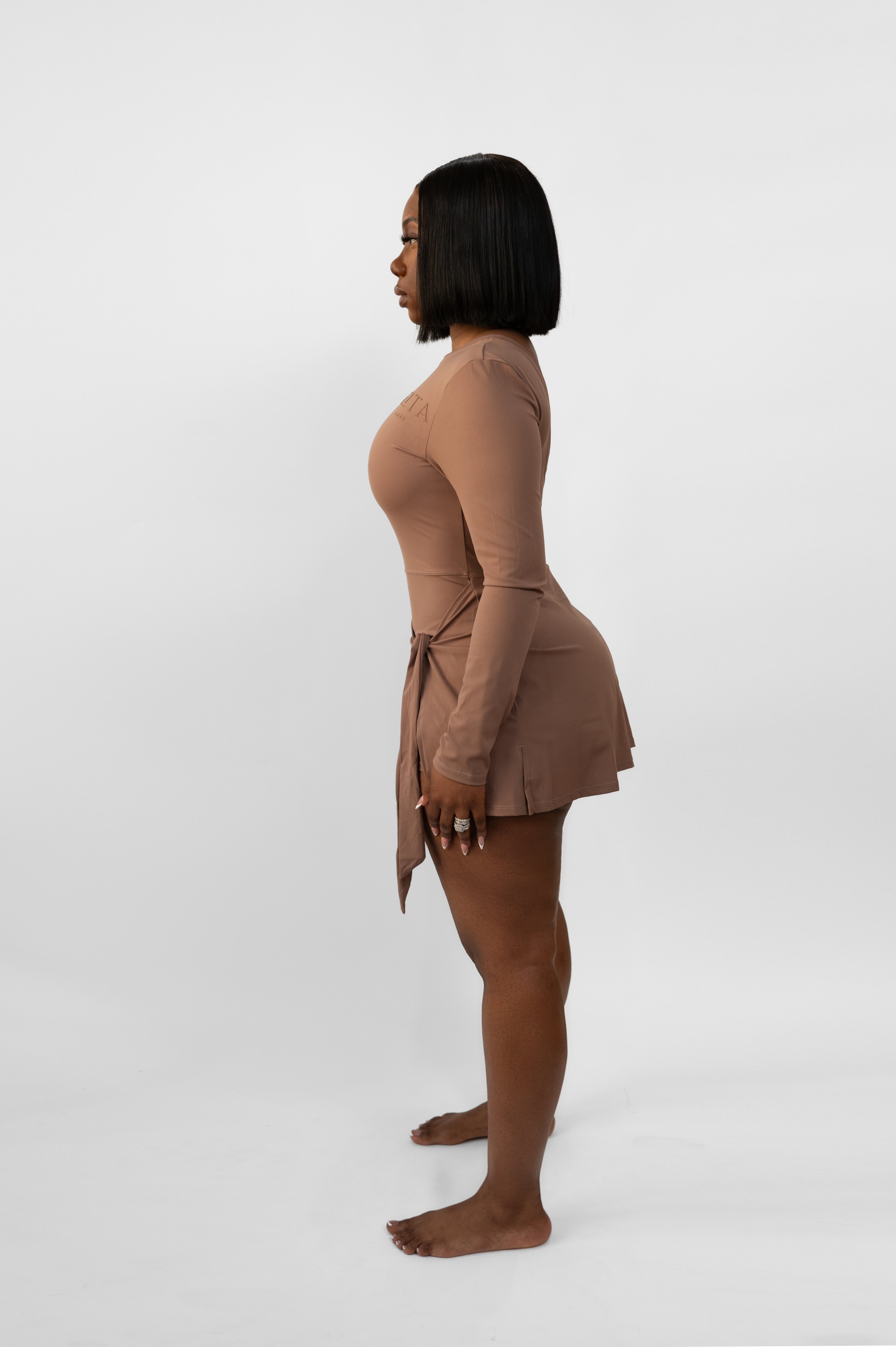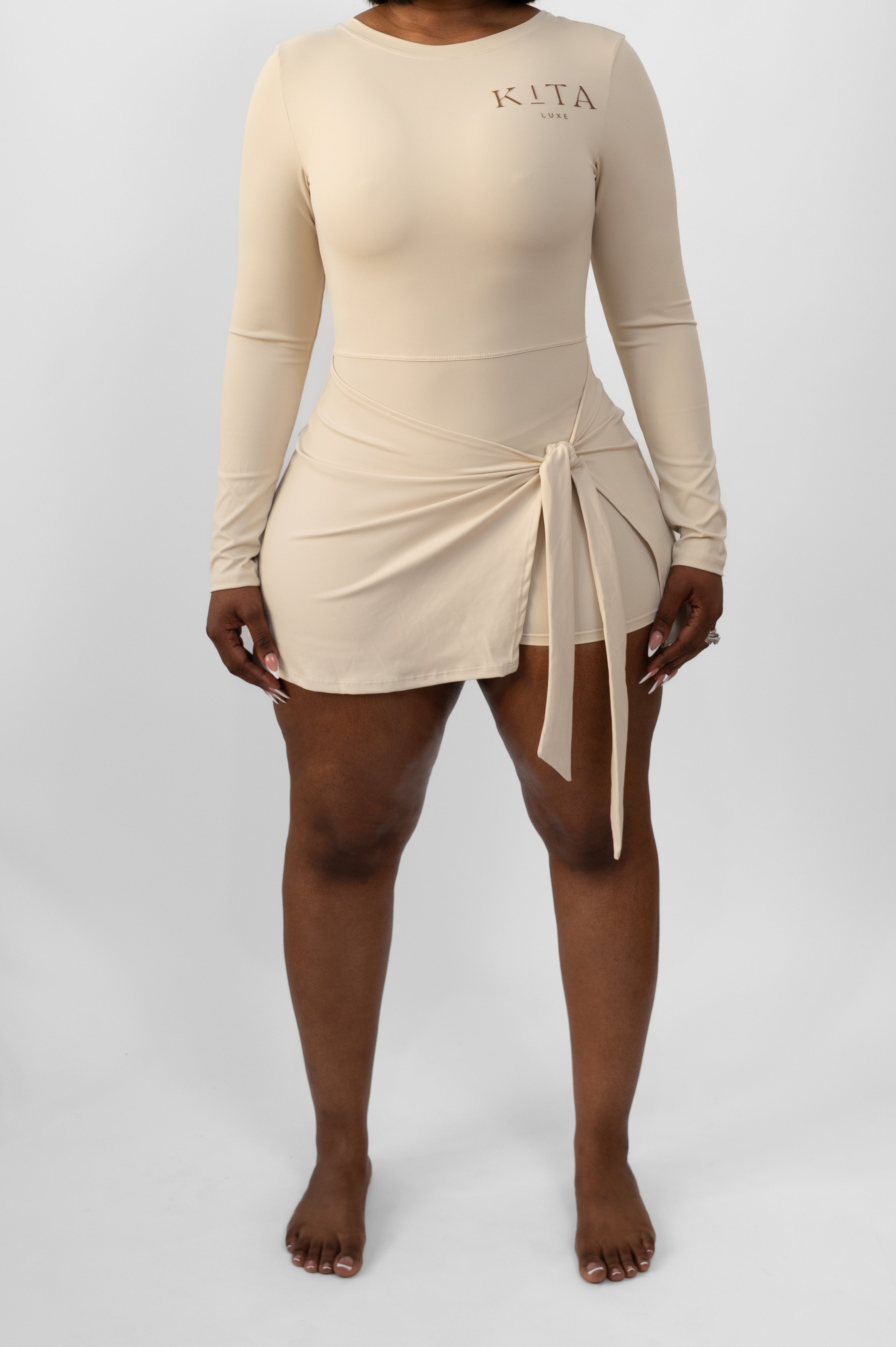 •  Breathable long sleeve solid color split binding slim tennis dress Unique Design Points: •  U-type hollow back design •  Sculpting fabric to enhance your natural shape + split strap design •  Bowknot design is fashionable + fake two-peice design •  Flattering A-line design with built-in anti-exposure shorts for extra support  and convenient •  Pleasted design better shows your charming...